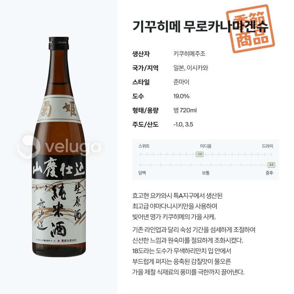 효고현 요카와시 특A지구에서 생산된 최고급 야마다니시키만을 사용해 빚어낸 명가 키쿠히메의 가을 사케. 기존 라인업과 달리 숙성 기간을 섬세하게 조절하여 신선한 느낌과 원숙미를 절묘하게 조화시켰다. 18도라는 도수가 무색하리만치 입 안에서 부드럽게 퍼지는 응축된 감칠맛이 물오른 가을 제철 식재료의 풍미를 극한까지 끌어낸다.