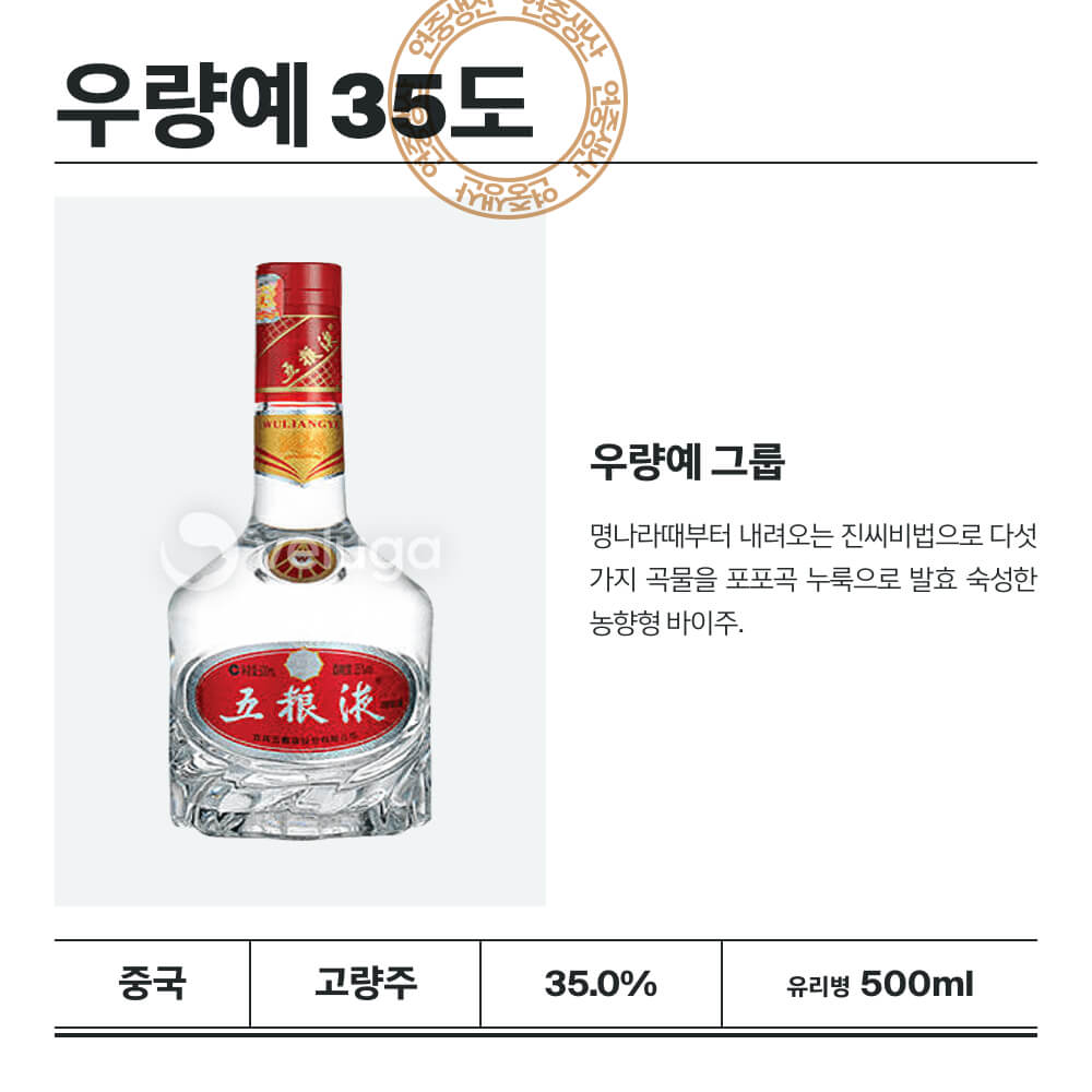 우량예 35도 - 유리병 500mL(WULIANGYE 35%) - 벨루가[용기 · 용량별 가격 보기] [발주하기] 주종: 중국술(Chinese Liquor), 스타일: 백주(Báijiǔ), 국가: 중국, 제조사: 우량예 그룹(Wuliangye Yibin Company Limited), 명나라때부터 내려오는 진씨비법으로 다섯가지 곡물을 포포곡 누룩으로 발효 숙성한 농향형 바이주.다른 가게 사장님의 솔직 후기