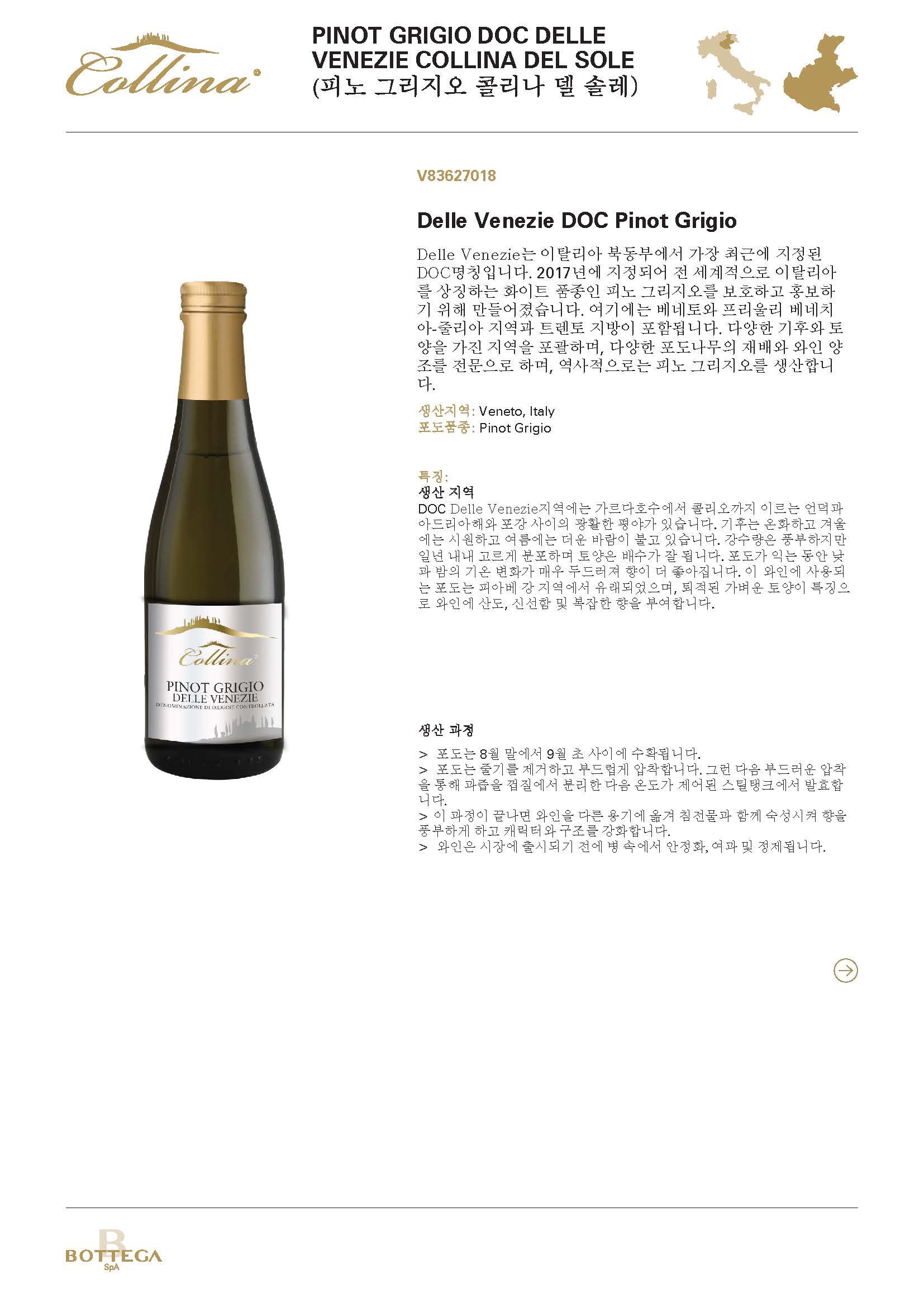 이태리 와이명가 BOTTEGA의 서브브랜드 Collina del Solle의 피콜로사이즈(187ml) 피노 그리지오 화이트 와인입니다.