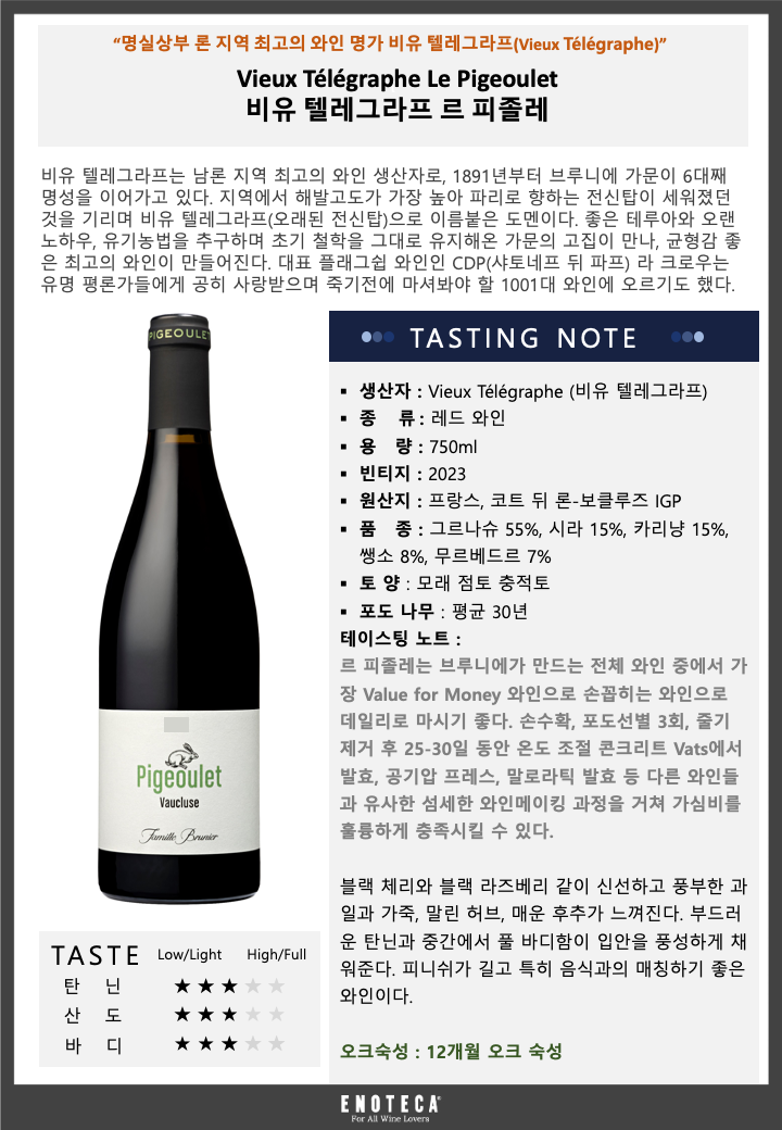 르 피졸레는 브루니에가 만드는 전체 와인 중에서 가장 Value for Money 와인으로 손꼽히는 와인으로 데일리로 마시기 좋다. 손수확, 포도선별 3회, 줄기 제거 후 25-30일 동안 온도 조절 콘크리트 Vats에서 발효, 공기압 프레스, 말로라틱 발효 등 다른 와인들과 유사한 섬세한 와인메이킹 과정을 거쳐 가심비를 훌륭하게 충족시킬 수 있다.