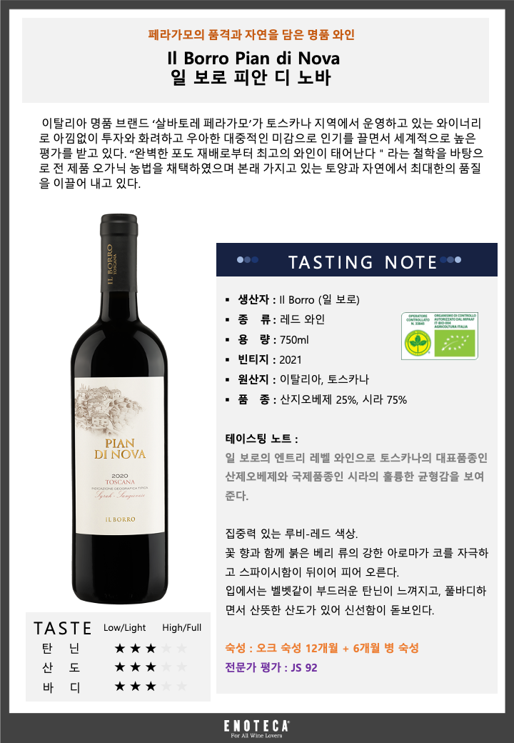 일 보로의 엔트리 레벨 와인으로 토스카나의 대표품종인 산제오베제와 국제품종인 시라의 훌륭한 균형감을 보여준다.
