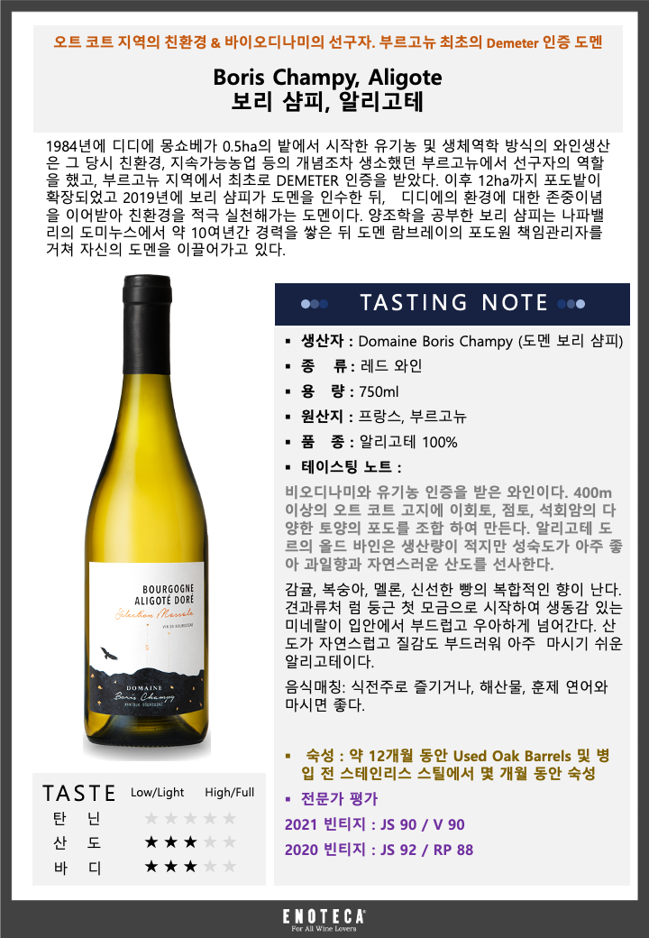도멘 보리 샴피 알리고테 22 - 유리병 750mL(Domaine Boris Champy Aligote 22) - 벨루가[용기 · 용량별 가격 보기] [발주하기] 주종: 와인(Wine), 스타일: 화이트 와인(White Wine), 주요 품종: 알리고테(Aligote), 국가: 프랑스, 지역: 부르고뉴, 제조사: Boris Champy, 1984년에 디디에 몽쇼베가 0.5ha의 밭에서 시작한 유기농 및 생체역학 방식의 와인생산은 그 당시 친환경 지속가능농업 등의 개념조차 생소했던 부르고뉴에서 선구자의 역할을 했고 부르고뉴 지역에서 최초로 DEMETER 인증을 받았다. 이후 12ha까지 포도밭이 확장되었고 2019년에 보리 샴피가 도멘을 인수한 뒤 디디에의 환경에 대한 존중이념을 이어받아 친환경을 적극 실천해가는 도멘이다. 양조학을 공부한 보리 샴피는 나파밸리의 도미누스에서 약 10여년간 경력을 쌓은 뒤 도멘 람브레이의 포도원 책임관리자를 거쳐 자신의 도멘을 이끌어가고 있다.