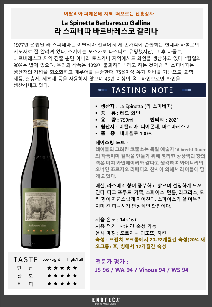 라 스피네따 바르바레스코 갈리나 21 - 유리병 750mL(La Spinetta Barbaresco Gallina 21) - 벨루가[용기 · 용량별 가격 보기] 공급사: 에노테카코리아주식회사 [전화 발주하기] 주종: 와인(Wine), 스타일: 레드 와인(Red Wine), 주요 품종: 네비올로(Nebbiolo), 국가: 이탈리아, 지역: 피에몬테, 제조사: La Spinetta(La Spinetta), 레이블의 그려진 코뿔소는 독일 예술가 ‘Albrecht Durer’의 작품이며 걸착을 만들기 위해 영리한 상상력과 창의력은 마치 와인메이커와 같다고 생각하여 와이너리의 오너인 조르지오 리베티의 찬사에 의해서 레이블에 담게 되었다. 매실 라즈베리 향이 풍부하고 밝으며 선명하게 느껴진다. 다크 프루트 가죽 스파이스 멘톨 리코리스 모카 향이 자연스럽게 이어진다. 스파이스가 잘 어우러지며 긴 피니시가 인상적인 와인이다.