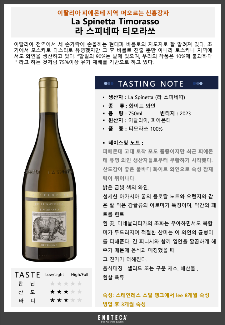 라 스피네따 티모라쏘 23 - 유리병 750mL(La Spinetta Timorasso 23) - 벨루가[용기 · 용량별 가격 보기] 공급사: 에노테카코리아주식회사 [전화 발주하기] 주종: 와인(Wine), 스타일: 화이트 와인(White Wine), 주요 품종: 티모라쏘 , 국가: 이탈리아, 지역: 피에몬테, 제조사: La Spinetta(La Spinetta), 피에몬테 고대 토착 포도 품종이지만 최근 피에몬테 유명 와인 생산자들로부터 부활하기 시작했다. 산도감이 좋은 풀바디 화이트 와인으로 숙성 잠재력이 뛰어나다. 밝은 금빛 색의 와인. 섬세한 아카시아 꿀의 플로랄 노트와 오렌지와 같은 잘 익은 감귤류의 아로마가 특징이며 약간의 페트롤 힌트. 흰 꽃 미네날리티가의 조화는 우아하면서도 복합미가 두드러지며 적절한 산미는 이 와인의 균형미를 더해준다.