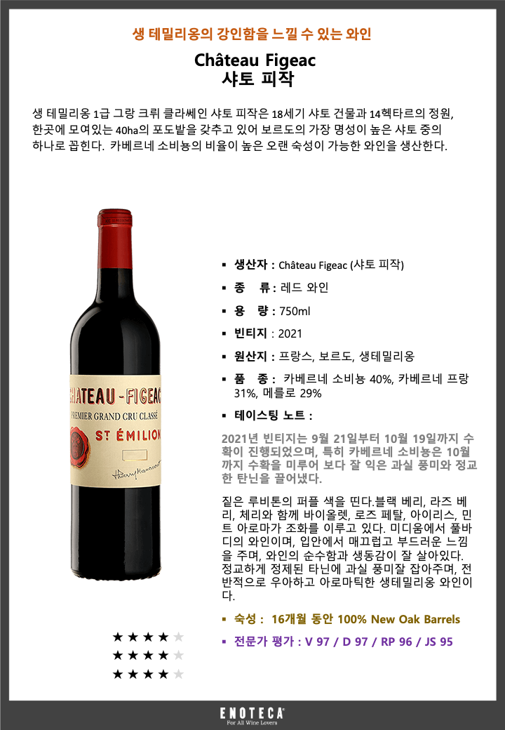 샤토 피작 21 - 유리병 750mL(Ch. Figeac 21) - 벨루가[용기 · 용량별 가격 보기] 공급사: 에노테카코리아주식회사 [전화 발주하기] 주종: 와인(Wine), 스타일: 레드 와인(Red Wine), 주요 품종: 카베르네 소비뇽 카베르네 프랑 메를로 , 국가: 프랑스, 지역: 보르도, 제조사: Bordeaux, 2021년 빈티지는 9월 21일부터 10월 19일까지 수확이 진행되었으며 특히 카베르네 소비뇽은 10월까지 수확을 미루어 보다 잘 익은 과실 풍미와 정교한 탄닌을 끌어냈다. 짙은 루비톤의 퍼플 색을 띤다.블랙 베리 라즈 베리 체리와 함께 바이올렛 로즈 페탈 아이리스 민트 아로마가 조화를 이루고 있다. 미디움에서 풀바디의 와인이며 입안에서 매끄럽고 부드러운 느낌을 주며 와인의 순수함과 생동감이 잘 살아있다. 정교하게 정제된 타닌에 과실 풍미잘 잡아주며 전반적으로 우아하고 아로마틱한 생테밀리옹 와인이다.