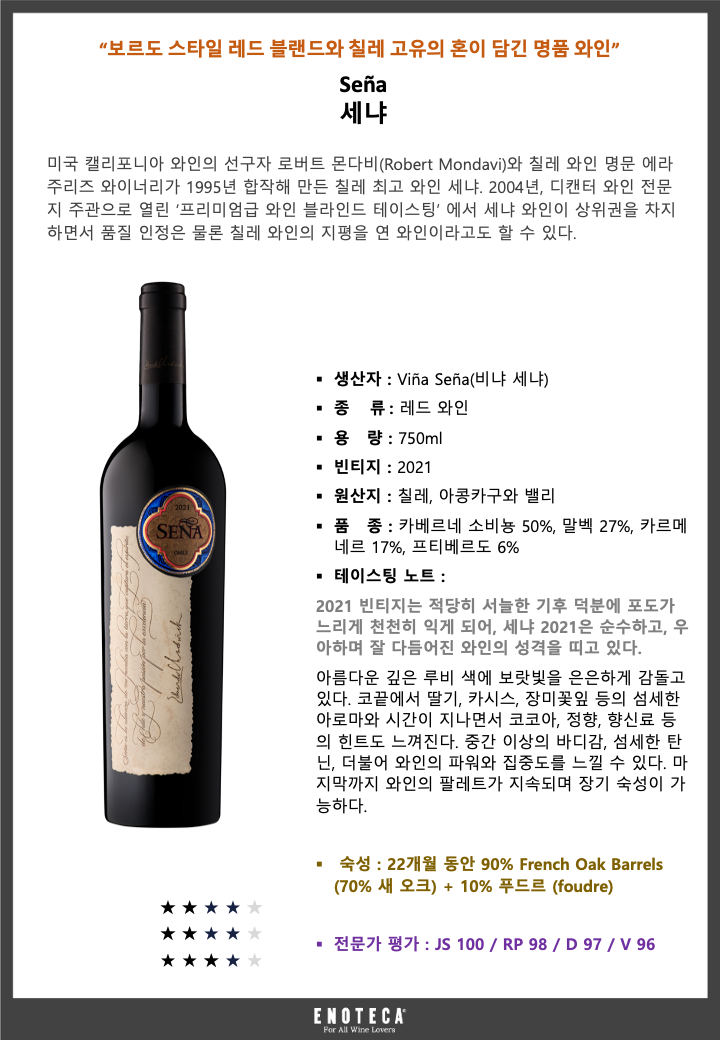 2021 빈티지는 적당히 서늘한 기후 덕분에 포도가 느리게 천천히 익게 되어 세냐 2021은 순수하고 우아하며 잘 다듬어진 와인의 성격을 띠고 있다. 아름다운 깊은 루비 색에 보랏빛을 은은하게 감돌고 있다. 코끝에서 딸기 카시스 장미꽃잎 등의 섬세한 아로마와 시간이 지나면서 코코아 정향 향신료 등의 힌트도 느껴진다. 중간 이상의 바디감 섬세한 탄닌 더불어 와인의 파워와 집중도를 느낄 수 있다. 마지막까지 와인의 팔레트가 지속되며 장기 숙성이 가능하다.