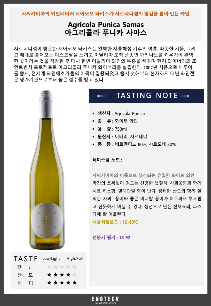 사씨카이아의 와인메이커 지아코모 타키스가 사르데냐섬의 영감을 받아 만든 와인 사씨카이아의 이름으로 생산되는 유일한 화이트 와인 약간의 초록빛이 감도는 선명한 볏짚색. 사과꽃향과 함께 시트 러스향 열대과일 향이 난다. 경쾌한 산도와 함께 잘 익은 사과 풍미와 좋은 미네랄 풍미가 어우러져 부드럽고 산뜻하게 마실 수 있다. 생선으로 만든 전채요리 파스타에 잘 어울린다.
