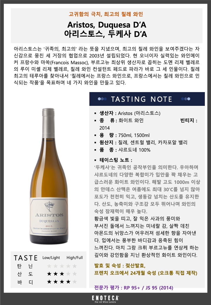 아리스토스 두케사 16 - 유리병 750mL(Aristos Duquesa 16) - 벨루가[용기 · 용량별 가격 보기] 공급사: 에노테카코리아주식회사 [전화 발주하기] 주종: 와인(Wine), 스타일: 화이트 와인(White Wine), 주요 품종: 샤르도네(Chardonnay), 국가: 칠레, 지역: 카차폴 안데스, 제조사: Aristos(Aristos), ‘두케사’는 귀족인 공작부인을 의미한다. 우아하며 샤르도네의 다양한 복합미가 입안을 꽉 채우는 고급스러운 화이트 와인이다. 해발 고도 1000m 이상의 안데스 산맥은 여름에도 최대 30’C를 넘지 않아 포도가 천천히 익고 생동감 넘치는 산도를 유지한다. 산도 농축미와 구조감 모두 뛰어나며 와인의 숙성 잠재력이 매우 높다. 황금색 빛을 띠고 잘 익은 사과의 풍미와 부서진 돌에서 느껴지는 미네랄 감 살짝 데친 아몬드의 뉘앙스가 어우러져 섬세한 향을 자아낸다. 입에서는 풍부한 바디감과 응축된 힘이 느껴진다. 마치 그랑 크뤼 부르고뉴를 연상케 하는 깊이와 강인함을 지닌 환상적인 화이트 와인이다