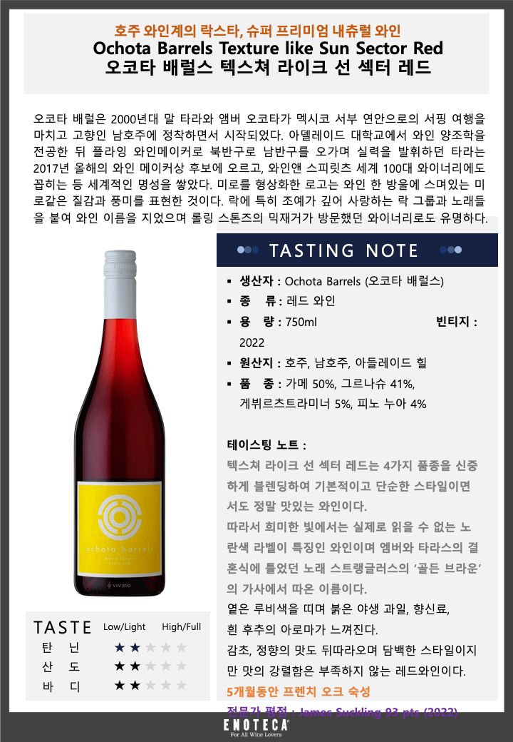 오코타 배럴스 텍스쳐 라이크 선 섹터 레드 22 (*) - 유리병 750mL(Ochota Barrels Texture like Sun Sector Red 22) - 벨루가[용기 · 용량별 가격 보기] 공급사: 에노테카코리아주식회사 [전화 발주하기] 주종: 와인(Wine), 스타일: 레드 와인(Red Wine), 주요 품종: 가메 그르나슈 게부르츠트라미너 피노 누아 , 국가: 오스트레일리아, 지역: 사우스 오스트레일리아, 제조사: Ochota Barrels, 텍스쳐 라이크 선 섹터 레드는 4가지 품종을 신중하게 블렌딩하여 기본적이고 단순한 스타일이면서도 정말 맛있는 와인이다. 따라서 희미한 빛에서는 실제로 읽을 수 없는 노란색 라벨이 특징인 와인이며 엠버와 타라스의 결혼식에 틀었던 노래 스트랭글러스의 ‘골든 브라운’의 가사에서 따온 이름이다. 옅은 루비색을 띠며 붉은 야생 과일 향신료 _x000B_흰 후추의 아로마가 느껴진다. 감초 정향의 맛도 뒤따라오며 담백한 스타일이지만 맛의 강렬함은 부족하지 않는 레드와인이다.