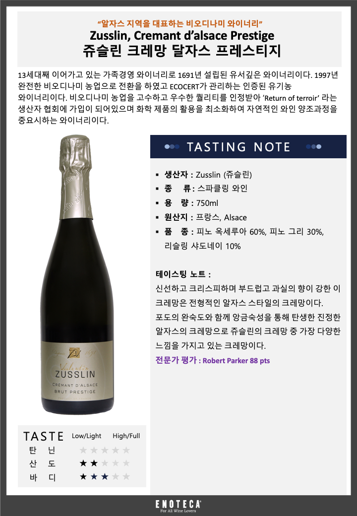 쥬슬린 크레망 달자스 프레스티지 NV - 유리병 750mL(Zusslin Cremant d'Alsace Prestige NV) - 벨루가[용기 · 용량별 가격 보기] 공급사: 에노테카코리아주식회사 [전화 발주하기] 주종: 와인(Wine), 스타일: 스파클링 와인(Sparkling Wine), 주요 품종: 옥세루아 피노 그리 리슬링샤르도네 , 국가: 프랑스, 지역: 알자스, 제조사: Zusslin, 신선하고 크리스피하며 부드럽고 과실의 향이 강한 이 크레망은 전형적인 알자스 스타일의 크레망이다. 포도의 완숙도와 함께 앙금숙성을 통해 탄생한 진정한 알자스의 크레망으로 쥬슬린의 크레망 중 가장 다양한 느낌을 가지고 있는 크레망이다.