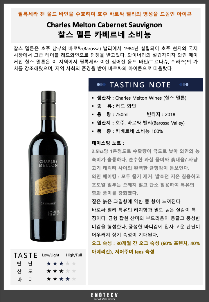 찰스 멜튼 카베르네 소비뇽 18 (스크류캡) - 유리병 750mL(Charles Melton Cabernet Sauvignon 18) - 벨루가[용기 · 용량별 가격 보기] 공급사: 에노테카코리아주식회사 [전화 발주하기] 주종: 와인(Wine), 스타일: 레드 와인(Red Wine), 주요 품종: 카베르네 소비뇽(Cabernet Sauvignon), 국가: 오스트레일리아, 지역: 사우스 오스트레일리아, 제조사: Charles Melton, 2.5ha당 1톤정도로 수확량이 극도로 낮아 와인의 농축미가 훌륭하다. 순수한 과실 풍미와 흙내음/ 사냥고기 캐릭터 사이의 완벽한 균형감이 돋보인다. 와인 메이킹 : 모두 줄기 제거. 발효전 저온 침용하고 포도알 일부는 으깨지 않고 탄소 침용하여 특유의 향과 풍미를 강화했다. 짙은 붉은 과일향에 약한 풀 향이 느껴진다. 바로싸 밸리 특유의 리치함과 밀도 높은 질감이 특징이다. 균형 잡힌 산미와 부드러움이 둥글고 풍성한 미감을 형성한다. 풍성한 바디감에 입자 고운 탄닌이 어우러져 장기 숙성이 기대된다.