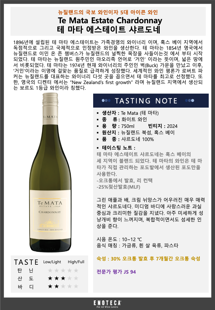 테 마타 에스테이트 샤르도네는 혹스 베이의 세 지역이 블랜드 되었다. 테 마타의 와인은 테 마타가 직접 관리하는 포도밭에서 생산된 포도만을 사용한다. -오크통에서 발효 리 컨택 -25%젖산발효(MLF) 그린 애플과 배 크림 뉘앙스가 어우러진 매우 매력적인 샤르도네다. 미디엄 바디에 사랑스러운 과실 중심과 크리미한 질감을 지녔다. 아주 미세하게 성냥개비 향이 느껴지며 복합적이면서도 섬세한 인상을 준다.