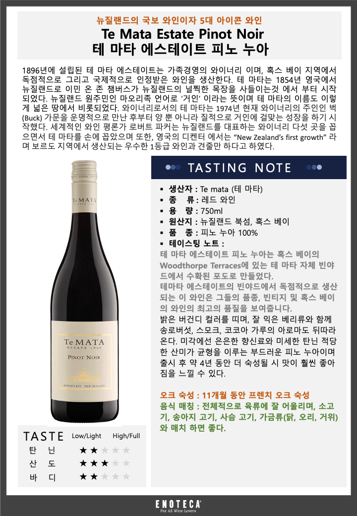 테 마타 에스테이트 피노 누아는 혹스 베이의 Woodthorpe Terraces에 있는 테 마타 자체 빈야드에서 수확된 포도로 만들었다. 테마타 에스테이트의 빈야드에서 독점적으로 생산되는 이 와인은 그들의 품종 빈티지 및 혹스 베이의 와인의 최고의 품질을 보여줍니다. 밝은 버건디 컬러를 띠며 잘 익은 베리류와 함께 송로버섯 스모크 코코아 가루의 아로마도 뒤따라 온다. 미각에선 은은한 향신료와 미세한 탄닌 적당한 산미가 균형을 이루는 부드러운 피노 누아이며 출시 후 약 4년 동안 더 숙성될 시 맛이 훨씬 좋아짐을 느낄 수 있다.
