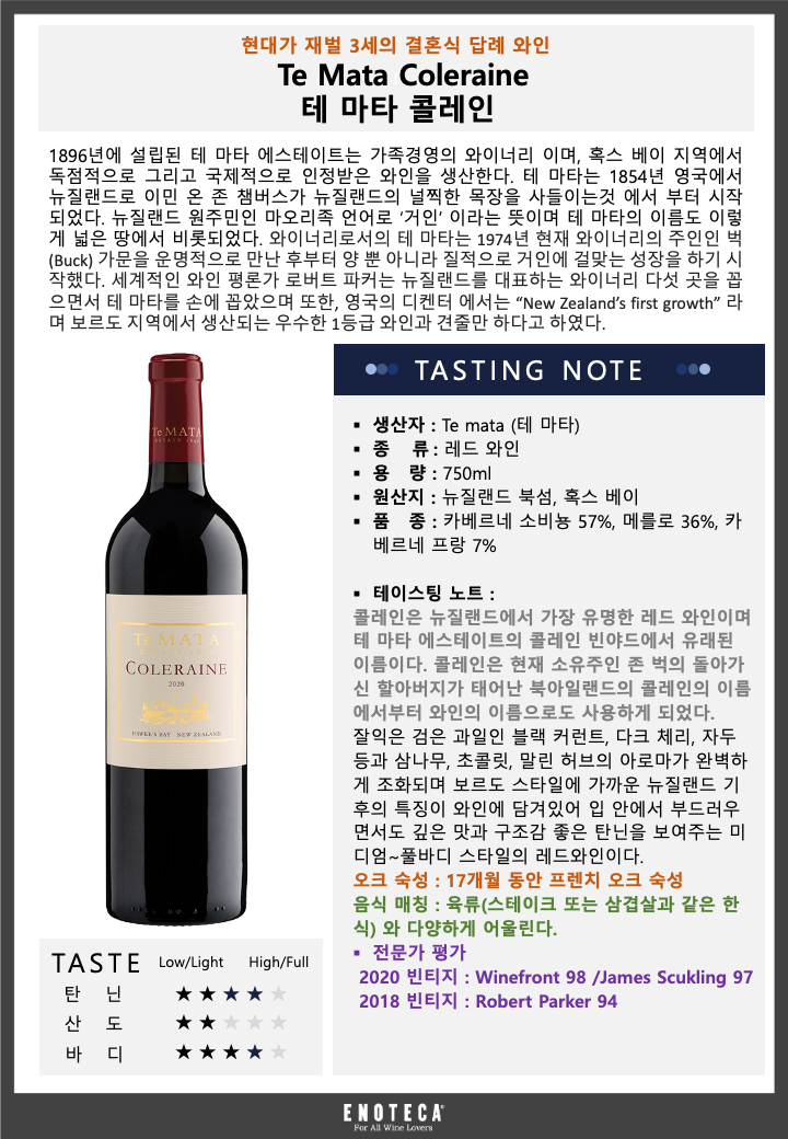 테 마타 콜레인 22 - 유리병 750mL(Te Mata Coleraine 22) - 벨루가[용기 · 용량별 가격 보기] 공급사: 에노테카코리아주식회사 [전화 발주하기] 주종: 와인(Wine), 스타일: 레드 와인(Red Wine), 주요 품종: 카베르네 소비뇽 메를로 카베르네 프랑 , 국가: 뉴질랜드, 지역: 노스 아일랜드, 제조사: Te Mata, 콜레인은 뉴질랜드에서 가장 유명한 레드 와인이며 테 마타 에스테이트의 콜레인 빈야드에서 유래된 이름이다. 콜레인은 현재 소유주인 존 벅의 돌아가신 할아버지가 태어난 북아일랜드의 콜레인의 이름에서부터 와인의 이름으로도 사용하게 되었다. 잘익은 검은 과일인 블랙 커런트 다크 체리 자두 등과 삼나무 초콜릿 말린 허브의 아로마가 완벽하게 조화되며 보르도 스타일에 가까운 뉴질랜드 기후의 특징이 와인에 담겨있어 입 안에서 부드러우면서도 깊은 맛과 구조감 좋은 탄닌을 보여주는 미디엄~풀바디 스타일의 레드와인이다.