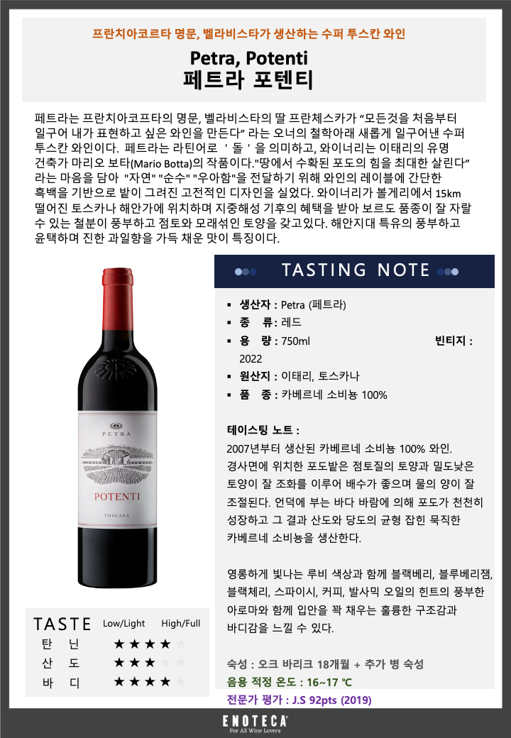 페트라 포텐티 22 - 유리병 750mL(Petra Potenti 22) - 벨루가[용기 · 용량별 가격 보기] 공급사: 에노테카코리아주식회사 [전화 발주하기] 주종: 와인(Wine), 스타일: 레드 와인(Red Wine), 주요 품종: 카베르네 소비뇽(Cabernet Sauvignon), 국가: 이탈리아, 지역: 토스카나, 제조사: Petra(Petra), 2007년부터 생산된 카베르네 소비뇽 100% 와인. 경사면에 위치한 포도밭은 점토질의 토양과 밀도낮은 토양이 잘 조화를 이루어 배수가 좋으며 물의 양이 잘 조절된다. 언덕에 부는 바다 바람에 의해 포도가 천천히 성장하고 그 결과 산도와 당도의 균형 잡힌 묵직한 카베르네 소비뇽을 생산한다. 영롱하게 빛나는 루비 색상과 함께 블랙베리 블루베리잼 블랙체리 스파이시 커피 발사믹 오일의 힌트의 풍부한 아로마와 함께 입안을 꽉 채우는 훌륭한 구조감과 바디감을 느낄 수 있다.