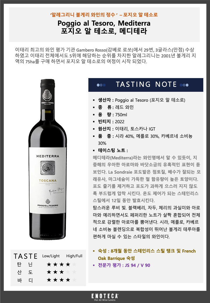 포지오 알 테소로 메디테라 22 - 유리병 750mL(Poggio al Tesoro Mediterra 22) - 벨루가[용기 · 용량별 가격 보기] 공급사: 에노테카코리아주식회사 [전화 발주하기] 주종: 와인(Wine), 스타일: 레드 와인(Red Wine), 주요 품종: 시라 메를로 카베르네 소비뇽 , 국가: 이탈리아, 지역: 토스카나, 제조사: Poggio al Tesoro(Poggio al Tesoro), 메디테라(Mediterra)라는 와인명에서 알 수 있듯이 지중해의 우아한 아로마와 바닷소금의 유혹적인 표현이 돋보인다. La Sondraie 포도밭은 점토질 배수가 잘되는 모래유사 마그네슘이 가득한 철 함유량이 높은 토양이다. 포도 줄기를 제거하고 포도가 과하게 으스러 지지 않도록 부드럽게 압착 시킨다. 온도 제어가 되는 스테인리스 스틸에서 12일 동안 발효시킨다. 탐스러운 루비 빛. 블랙베리 자두 체리의 과실미와 아로마와 예리하면서도 페퍼리한 노트가 살짝 혼합되어 전체적으로 강렬한 아로마를 뿜어낸다. 시라 메를로 카베르네 소비뇽 블렌딩으로 복합성이 뛰어난 볼게리 테루아를 편하게 마실 수 있는 스타일의 와인이다.