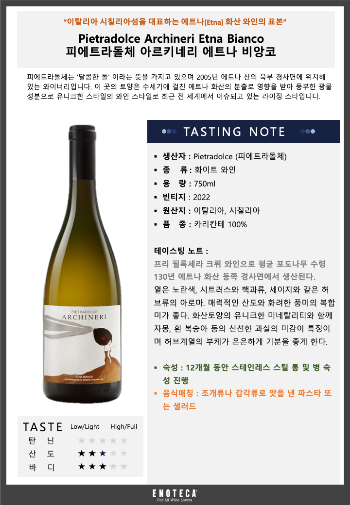피에트라돌체 아르키네리 에트나 비앙코 22 - 유리병 750mL(Pietradolce Archineri Etna Bianco 22) - 벨루가[용기 · 용량별 가격 보기] 공급사: 에노테카코리아주식회사 [전화 발주하기] 주종: 와인(Wine), 스타일: 화이트 와인(White Wine), 주요 품종: 카리칸테(Carricante), 국가: 이탈리아, 지역: 시칠리아, 제조사: Pietradolce(Pietradolce), 프리 필록세라 크뤼 와인으로 평균 포도나무 수령 130년 에트나 화산 동쪽 경사면에서 생산된다. 옅은 노란색 시트러스와 핵과류 세이지와 같은 허브류의 아로마. 매력적인 산도와 화려한 풍미의 복합미가 좋다. 화산토양의 유니크한 미네랄리티와 함께 자몽 흰 복숭아 등의 신선한 과실의 미감이 특징이며 허브계열의 부케가 은은하게 기분을 좋게 한다.