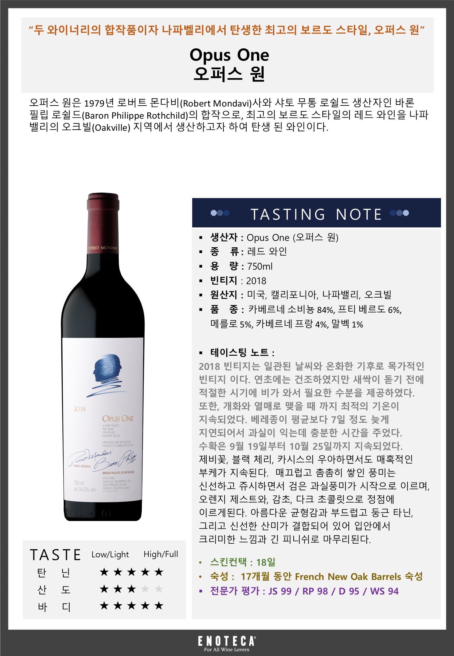 오퍼스 원 18 - 유리병 750mL(Opus One 18) - 벨루가[용기 · 용량별 가격 보기] [발주하기] 주종: 와인(Wine), 스타일: 레드 와인(Red Wine), 주요 품종: 메를로(Merlot)/프티 베르도(Petit Verdot)/카베르네 소비뇽, 국가: 미국, 지역: 나파밸리, 제조사: Opus One(Opus One), 오퍼스 원은 1979년 로버트 몬다비(Robert Mondavi)사와 샤토 무통 로쉴드 생산자인 바론 필립 로쉴드(Baron Philippe Rothchild)의 합작으로, 최고의 보르도 스타일의 레드 와인을 나파 밸리의 오크빌(Oakville) 지역에서 생산하고자 하여 탄생 된 와인이다.
