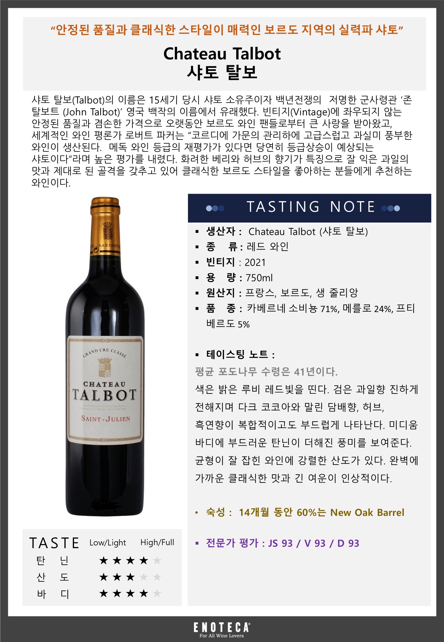샤토 탈보(Talbot)의 이름은 15세기 당시 샤토 소유주이자 백년전쟁의 저명한 군사령관 ‘존 탈보트 (John Talbot)’ 영국 백작의 이름에서 유래했다. 빈티지(Vintage)에 좌우되지 않는 안정된 품질과 겸손한 가격으로 오랫동안 보르도 와인 팬들로부터 큰 사랑을 받아왔고, 세계적인 와인 평론가 로버트 파커는 “코르디에 가문의 관리하에 고급스럽고 과실미 풍부한 와인이 생산된다. 메독 와인 등급의 재평가가 있다면 당연히 등급상승이 예상되는 샤토이다”라며 높은 평가를 내렸다. 화려한 베리와 허브의 향기가 특징으로 잘 익은 과일의 맛과 제대로 된 골격을 갖추고 있어 클래식한 보르도 스타일을 좋아하는 분들에게 추천하는 와인이다.