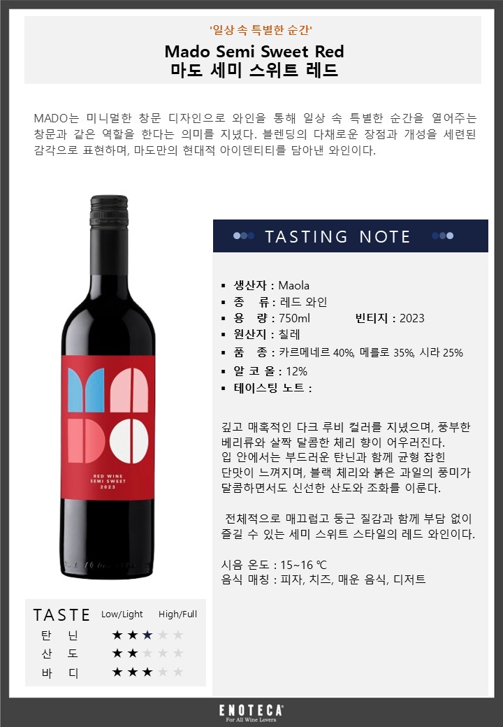 마도 세미 스위트 레드 23 (스크류캡) - 유리병 750mL(Mado Semi Sweet Red 23) - 벨루가[용기 · 용량별 가격 보기] [발주하기] 주종: 와인(Wine), 스타일: 레드 와인(Red Wine), 주요 품종: 카르메네르(Carmenere)/메를로(Merlot)/시라(시라), 국가: 칠레, 지역: 칠레, 제조사: 마도(Mado), MADO는 미니멀한 창문 디자인으로 와인을 통해 일상 속 특별한 순간을 열어주는 창문과 같은 역할을 한다는 의미를 지녔다. 블렌딩의 다채로운 장점과 개성을 세련된 감각으로 표현하며, 마도만의 현대적 아이덴티티를 담아낸 와인이다.