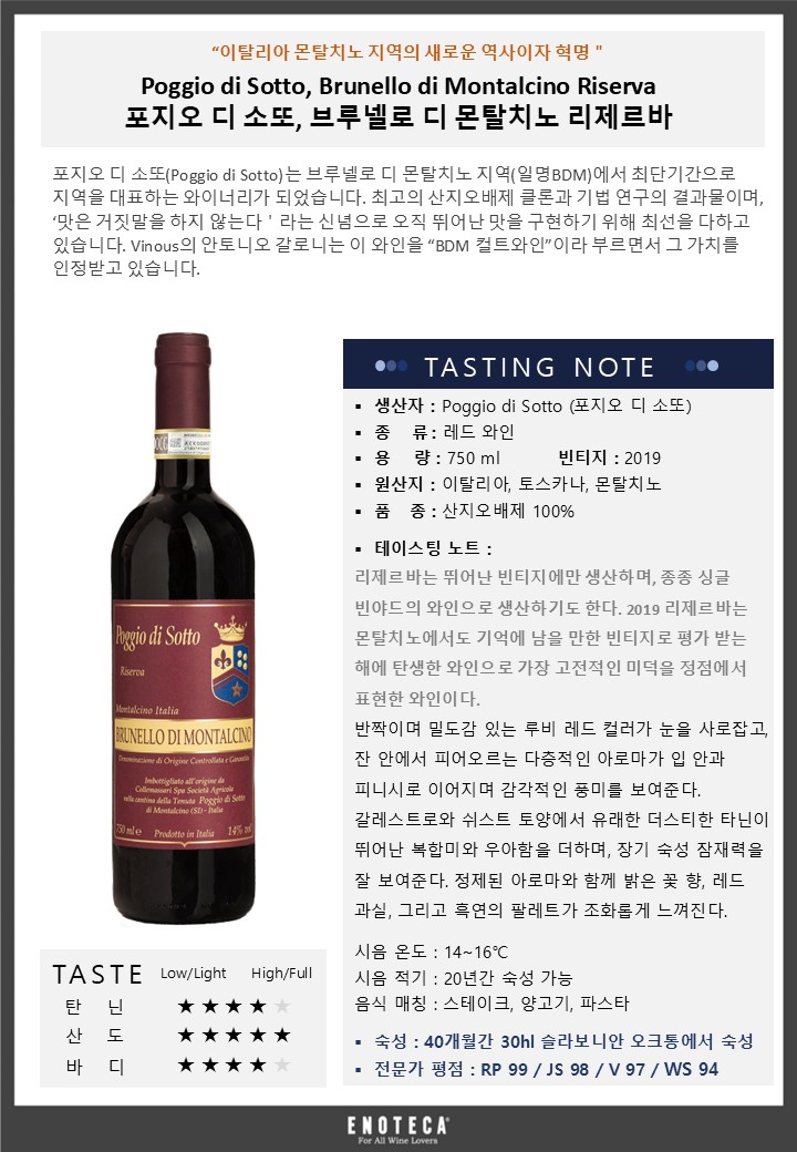 포지오 디 소또 브루넬로 디 몬탈치노 리제르바 19 - 유리병 750mL(Poggio di Sotto Brunello di Montalcino Riserva 19) - 벨루가[용기 · 용량별 가격 보기] [발주하기] 주종: 와인(Wine), 스타일: 레드 와인(Red Wine), 주요 품종: 산지오베제, 국가: 이탈리아, 지역: 몬탈치노, 제조사: 포지오 디 소또(Poggio di Sotto), 포지오 디 소또(Poggio di Sotto)는 브루넬로 디 몬탈치노 지역(일명BDM)에서 최단기간으로 지역을 대표하는 와이너리가 되었습니다. 최고의 산지오배제 클론과 기법 연구의 결과물이며, ‘맛은 거짓말을 하지 않는다'라는 신념으로 오직 뛰어난 맛을 구현하기 위해 최선을 다하고 있습니다. Vinous의 안토니오 갈로니는 이 와인을 “BDM 컬트와인”이라 부르면서 그 가치를 인정받고 있습니다.
