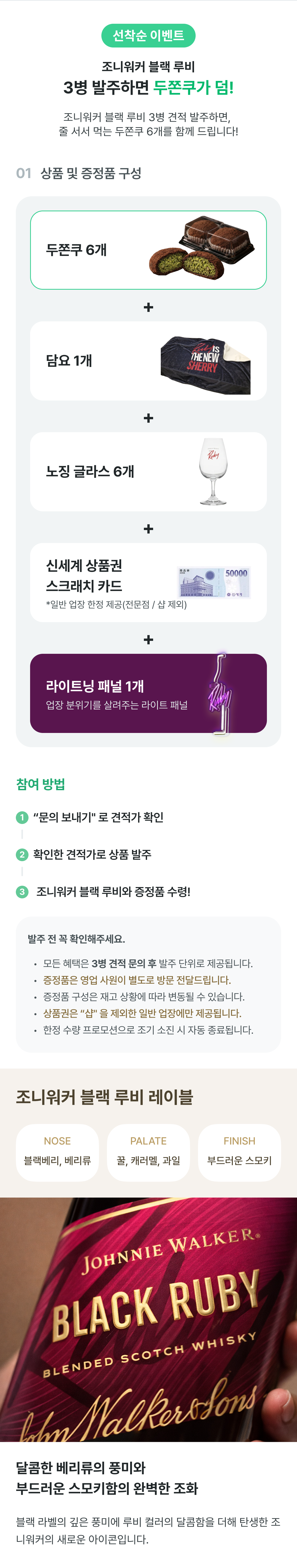 조니워커 블랙 루비 레이블 - 유리병 700mL(Johnnie Walker Black Ruby Label) - 벨루가[용기 · 용량별 가격 보기] [발주하기] 주종: 위스키(Whisky), 스타일: 블렌디드 위스키(Blended Whisky), 국가: 영국, 제조사: DIAGEO SCOTLAND LIMITED(DIAGEO SCOTLAND LIMITED), 조니워커 블랙 루비는 조니워커 블랙 라벨을 바탕으로, 더 달콤하고 과실감 있게 풀어낸 블렌디드 스카치 위스키다. 레드 와인 캐스크와 버번 캐스크 숙성 원액이 어우러져 무화과·자두·마라스키노 체리 같은 진한 과실 향을 내고, 입안에서는 꿀·라즈베리 잼·블랙베리 뉘앙스가 부드럽게 퍼진다. 마무리에는 은은한 향신료와 스모키함이 남아, 조니워커 특유의 깊이는 유지하면서도 한층 화려하고 달콤한 인상을 전한다. 스트레이트는 물론, 하이볼이나 과실 계열 칵테일 베이스로도 잘 어울리는 스타일이다.
