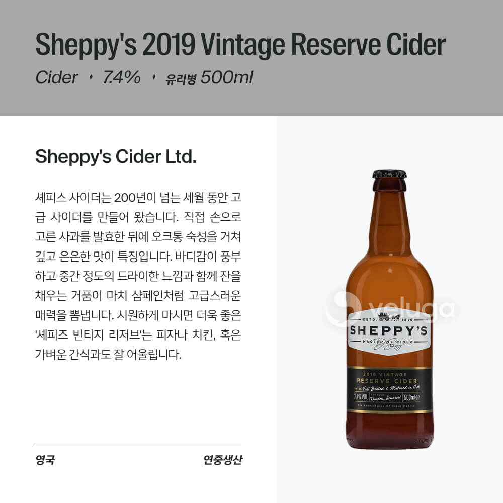 셰피즈 빈티지 리저브 - 유리병 500mL(Sheppy's 2019 Vintage Reserve Cider) - 벨루가[용기 · 용량별 가격 보기] [발주하기] 주종: 과실주(Fruit Liquor), 스타일: 사이더(Cider), 국가: 영국, 제조사: 셰피스 사이더(Sheppy's Cider Ltd.), 셰피스 사이더는 200년이 넘는 세월 동안 고급 사이더를 만들어 왔습니다.