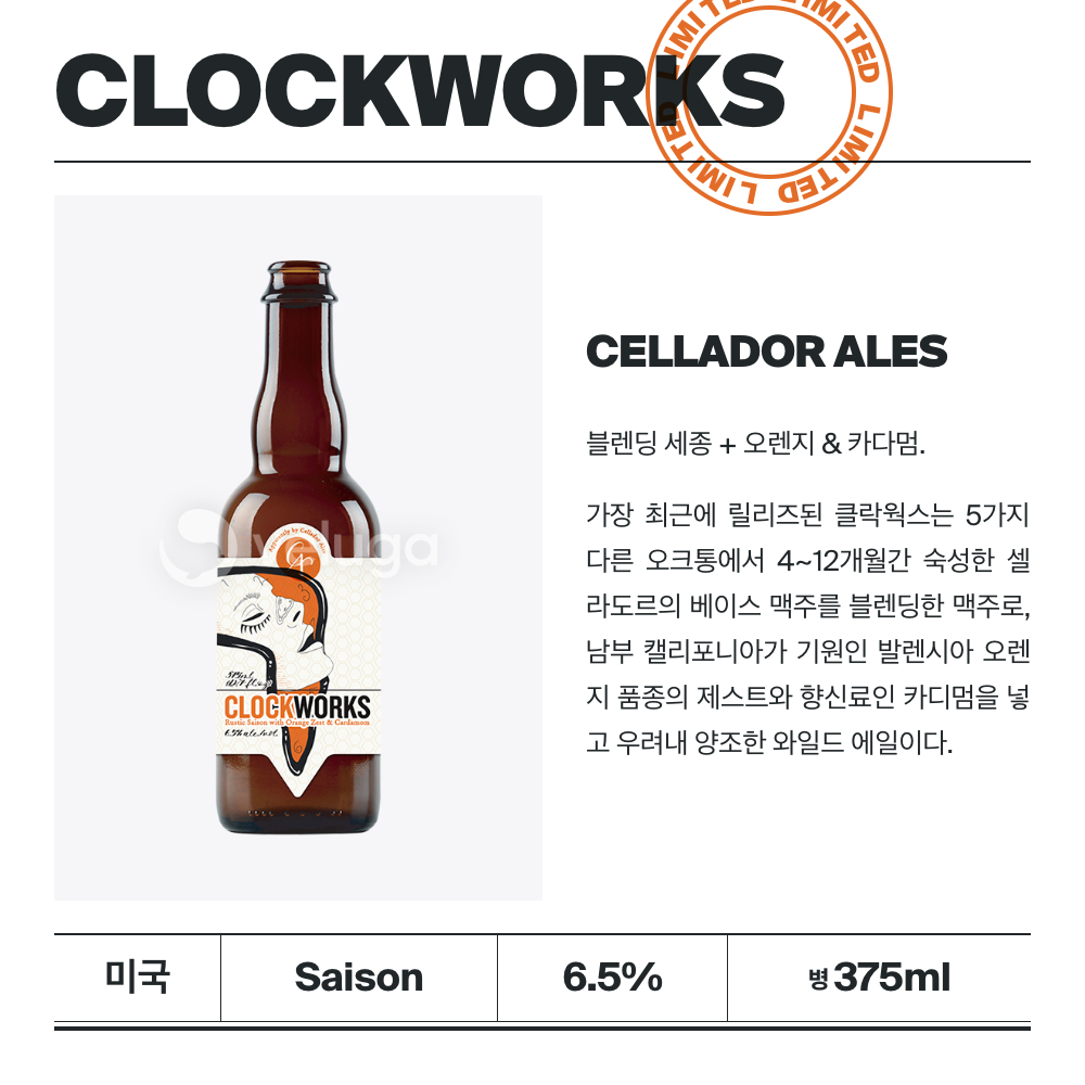 클락웍스 - 유리병 375mL(Clockworks) - 벨루가[용기 · 용량별 가격 보기] [발주하기] 주종: 수입 맥주(Imported Beer), 스타일: 세종(Saison), 국가: 미국, 제조사: 셀라도르 에일즈(Cellador Ales), 블렌딩 세종 + 오렌지 & 카다멈.